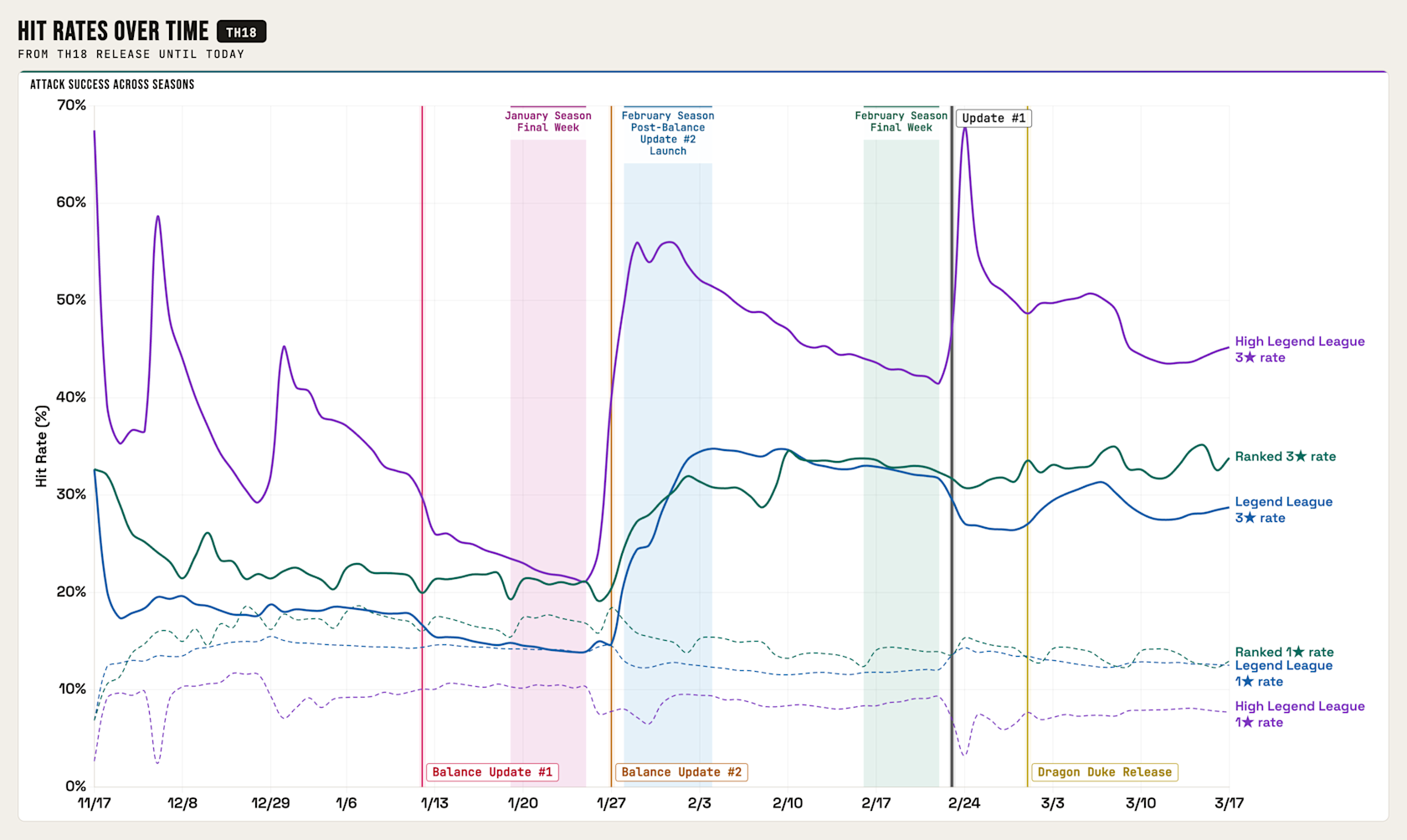 Logo após o lançamento do CV18, as taxas de vitórias com 3 estrelas e 1 estrela estavam muito próximas. Isso indicou um meta polarizado: ou os ataques eram perfeitos ou falhavam completamente, sem meio-termo.